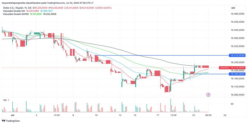 Sementara itu, untuk support sebagai area pembalikan arah menguat bisa dicermati di Rp16.185/US$ yang didapatkan dari low candle intraday 19 Juli 2024.